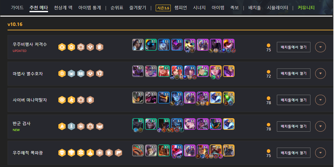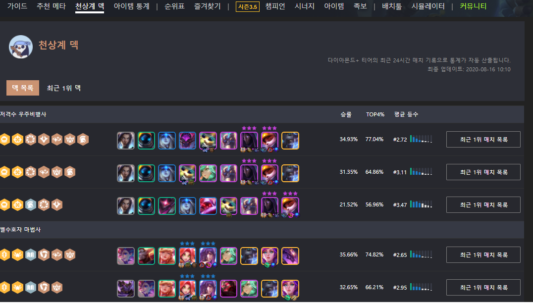 우리가 가장 많이 참고해야 하는 데이터다. 승률과 주요 챔피언의 아이템들을 확인할 수 있다. 특히나 최근 1위 매치 목록을 통해서 세세한 부분까지 확인할 수 있어서 덱을 연구하는 데 더없이 좋은 자료가 된다.