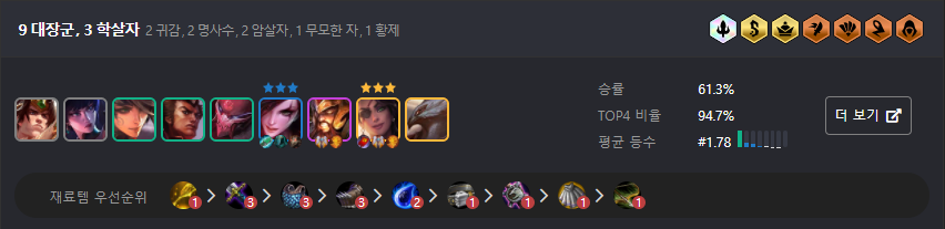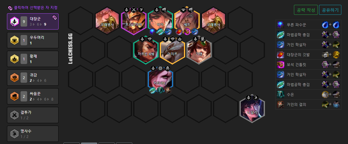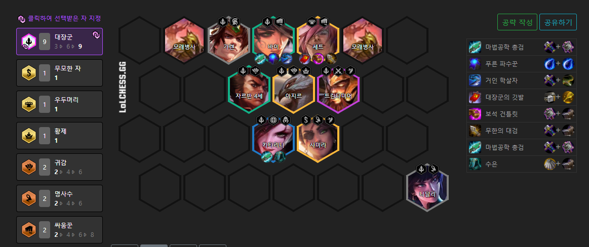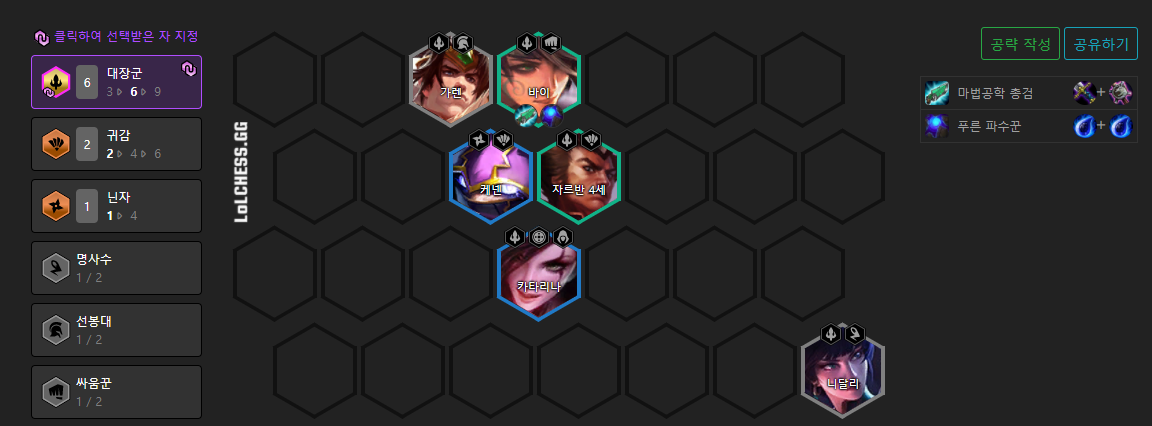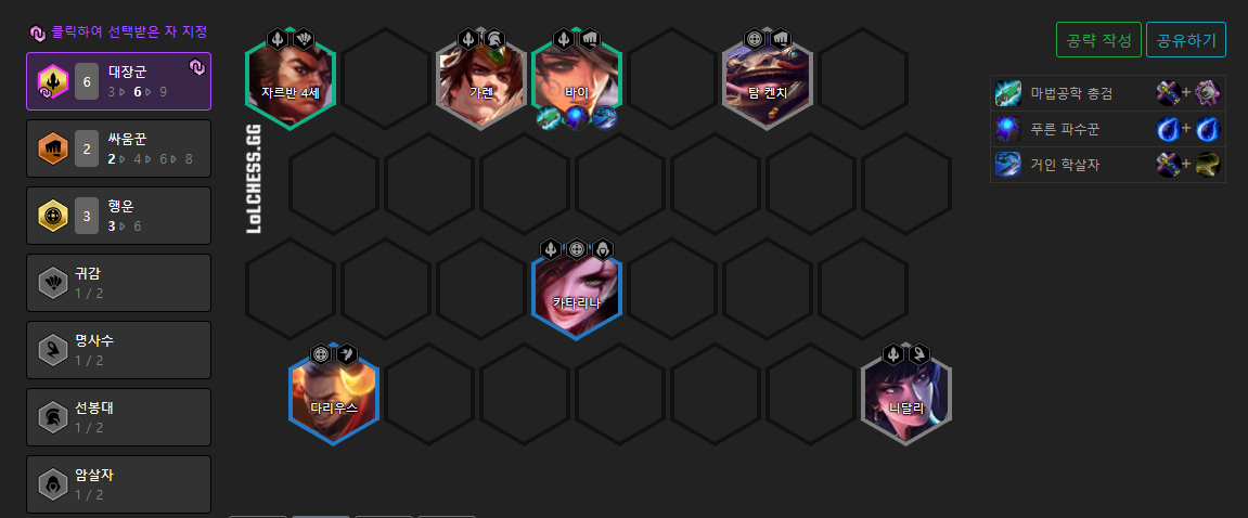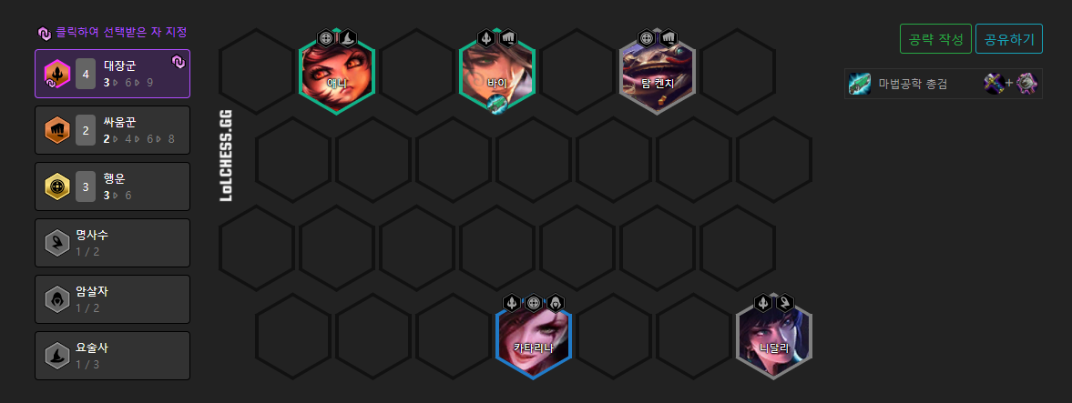 이렇게 생각하자. 니달리, 바이, 카타 중 3성작이 되는 챔피언을 템 투입 후 활용한다.