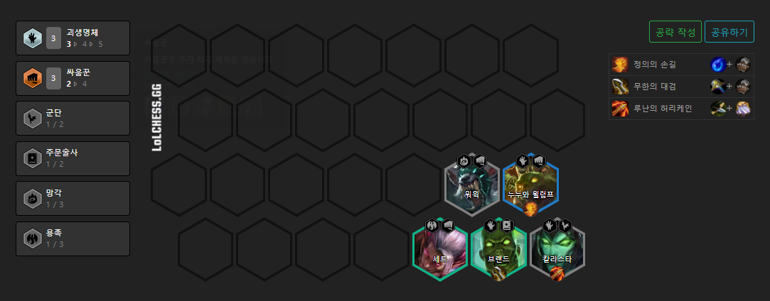 *괴생명체는 챔피언 하나당 하나씩의 아이템을 가져와서 총 3개를 쓸 수 있습니다.